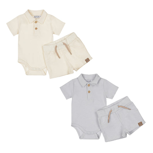 Dirkje Baby Jungen 2 Sets – Polostrampler & Shorts – Hellblau/Off-White "Love"