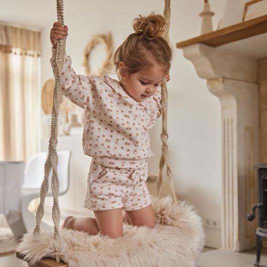 Diese Shorts von Dirkje in Hellrosa mit einem entzückenden Blumenprint sind ideal für warme Tage. Der elastische Bund mit einer großen Schleife sorgt für einen bequemen Sitz und einen verspielten Look. Der strukturierte Stoff macht diese Shorts besonders charmant. Perfekt für Spielverabredungen, den Urlaub oder einfach für den Alltag zu Hause.